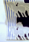 こちらにご紹介させていただく作品は洛風林の八寸名古屋帯「シュバル」です。 アンドレブ・ラジリエをオマージュした作品で蒼い木立の中を駆け抜ける二頭の馬が幻想的な印象で表現されています。