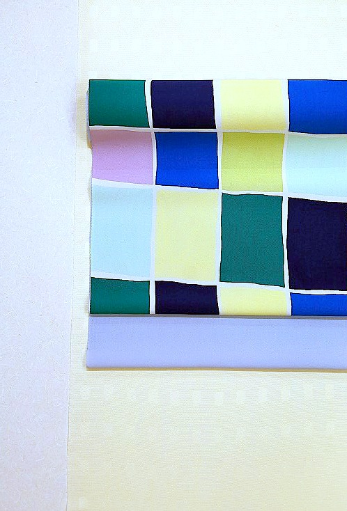 本品は思わず心が浮き立つような色とりどりの格子模様を手描友禅で描き上げたパレット。 補色を並べ合わせている訳ではないのにこの収まり、巧みな色合わせです。