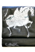 他方、ギリシャではペガサスは古来より自由や勇気の象徴とされてきました。 天を舞う姿は地上の現実を超越する自由を表しています。 ギリシャ文学や芸術においても折々に書かれ、ヒッポクレネの泉の水を飲むことでペガサスの力を得ると信じられてきたそうです。 ペガサスは西洋美術においても繰り返し描かれてきました。 ルネサンス期の絵画では神の使いとして天を舞うペガサスが数多く描かれています。 帯地の漆箔の墨黒は最後は夜空に登り星座となったペガサス座を想わせてくれます。
