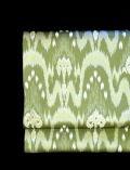 この西陣織、ただ単なる礼装の際の袋帯と捉えるには些か一面的であると言わざるを得ません。 この西陣織を指し示す際は「礼装的な」なる表現が適うのかも知れません。 しかし、実際に帯地として、着物に適わせた際に「礼装的な」と言う単純な印象は一蹴されます。 経錦織物としての織物の質感が極めて高く「礼装的な」と言う単純な表現では尽くせない趣が保たれているのです。 この趣なるものが何であるか、それは経錦特有の織は無論、この「色彩」に尽きるのではないでしょうか。 抹茶色、あるいは苔色、青磁を含んだ草色、どれもそのようであり、どの表現も違うような、…言葉で表現出来ない絶妙なお色目、これまでの制作の積み重ねで創られた「色彩」であるのです。 帯に使われたひとつの色が、そのまま目に入るのではなく 紋様の色と相俟って本来そのものが保つ「色」以上の「色」を表現しているのです。 構図としては正統な太子間道が織られたもので 帯の構図として特に珍しいものではありません。 しかし、そうした構図に籠められた「色彩」の「創造」がこの帯の美しさを際立たせているのだと思います。
