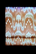それはやはりこの文様と色に尽きるのではないでしょうか。 渋紙色 しぶかみいろ に山葵色 わさびいろ を滲ませたようなお色目で間道が織り出されています。 ご覧いただけますように可愛いという印象ではありません。 むしろある種の迫力を感じます。 法隆寺献上宝物に見る太子間道とは印象を異にします。むしろそれは単純に太子間道を模すのではなく、法隆寺宝物の美意識へのオマージュとしての制作なのかもしれません。 深読みかもしれませんが、もしかすると北村武資氏はとても手間の掛かる仕事を積み重ね、それらを超えようとしたのかもしれません。 眺めていると文様に使われたひとつ一つの色が、直接的に目に映るのではなく、地色や周りの他の色と相乗して本来そのものが保つ「色」以上の「色」、もっと言えば「文様」以上の「文様」となっているのです。 太子間道は帯の意匠としてはとりわけ珍しいものではありません。しかし、その構図に籠められた色の創造と文様美がこの帯の美しさを際立たせているのだと思います。