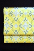 それはやはりこの文様と色に尽きるのではないでしょうか。 一般的な色彩感覚で言えば、このように黄色という色は琉球王朝の王族の衣装などを除けば、一般的には可愛さのような印象を感じてしまうことが多いのですが、ご覧いただけますように可愛いという印象ではないのです。 むしろある種の迫力を感じるんですね。 そうした印象を誘う色や文様のすべては、とても手間の掛かる仕事を積み重ねて創られています。 文様に使われたひとつ一つの色が、直接的に目に映るのではなく、地色や周りの他の色と相乗して本来そのものが保つ「色」以上の「色」、もっと言えば「文様」以上の「文様」となっているのです。 構図としては花を菱形に象形したいわゆる割付文様です。 帯の構図としてはとりわけ珍しいものではありません。しかし、その構図に籠められた色の創造と文様美がこの帯の美しさを際立たせているのだと思います。